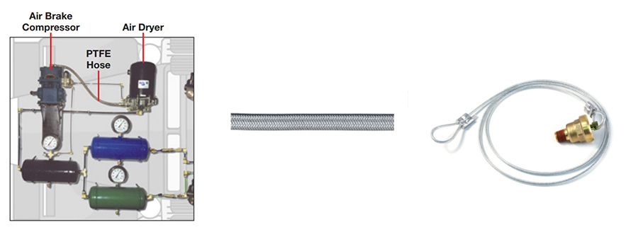 Kompresör sistemi üç bileşenden oluşur: kompresör, hava kurutma makinesi ve bağlantı hortumu veya boru. Kompresör tarafından üretilen hava akışı şartlandırılana kadar kullanılamaz. Ham basınçlı hava ile ilgili iki sorun vardır. İlk olarak, kompresörden gelen hava standart boru için çok sıcaktır. PTFE hortumu, kompresörü kurutucuya bağlamak için kullanılır, çünkü 400 ° F'ye kadar sıcaklıkları işleyebilir. PTFE hortumu, hem kapak hem de takviye görevi gören paslanmaz çelik örgü ile tanımlanabilir.